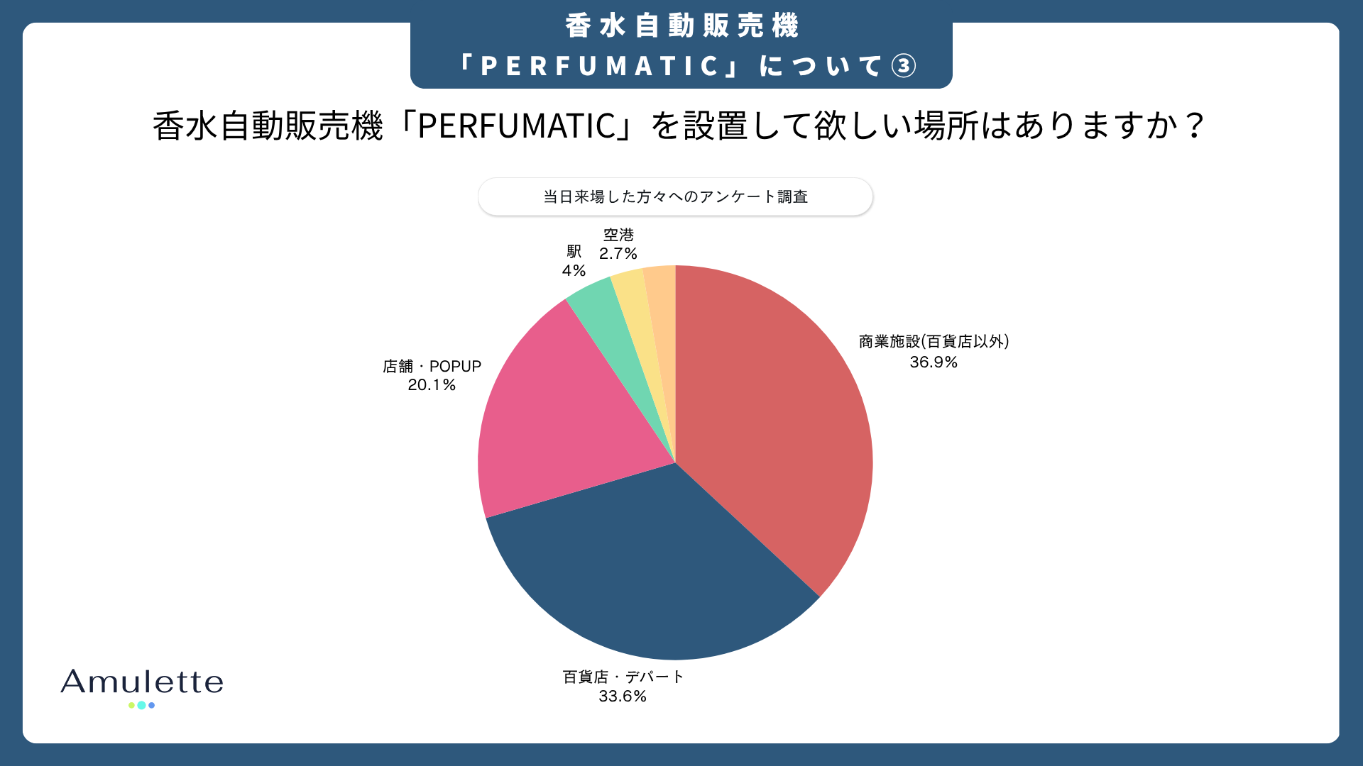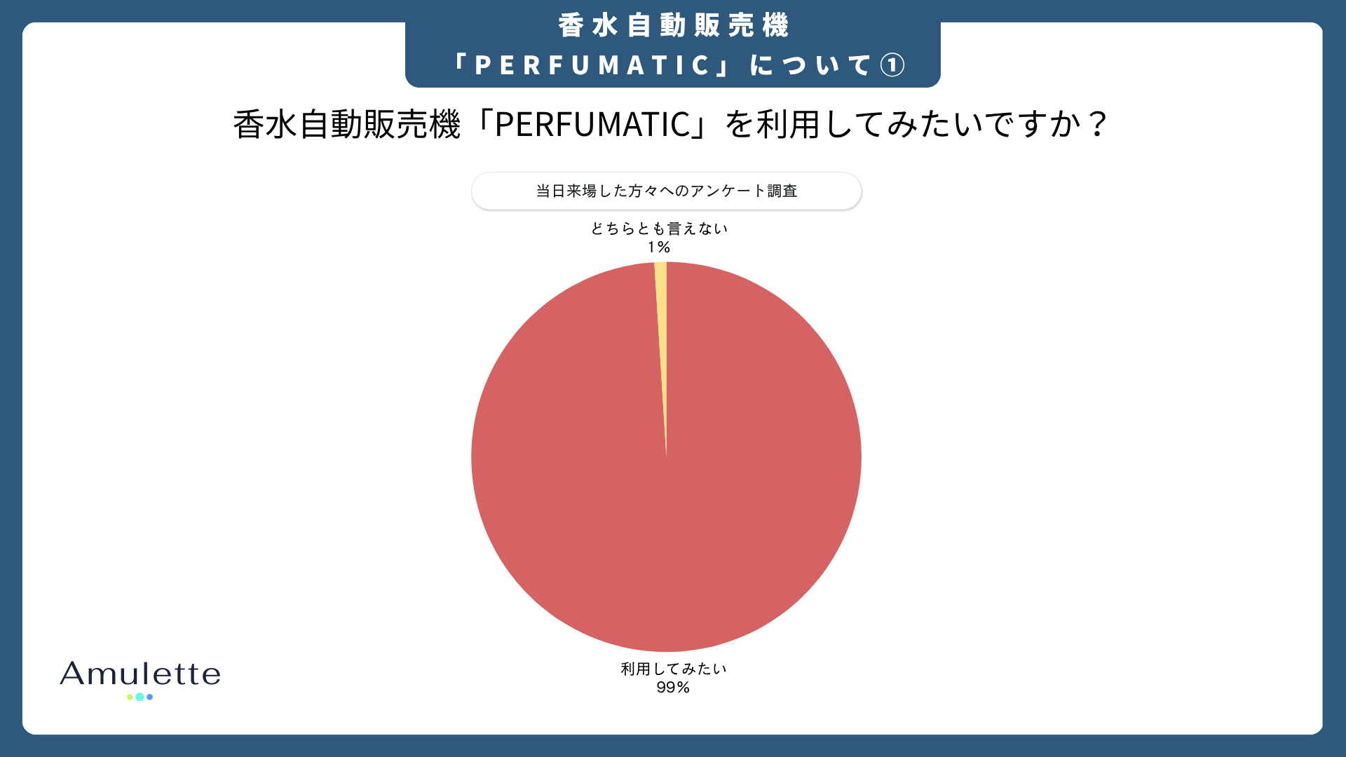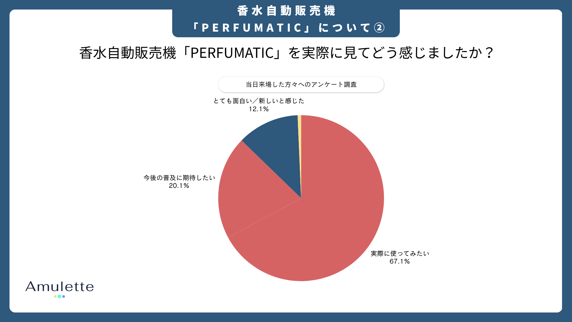 また、当日来場された方々を対象に実施したアンケートでは、香水自動販売機「PERFUMATIC」に対し、非常に高い関心が寄せられました。
